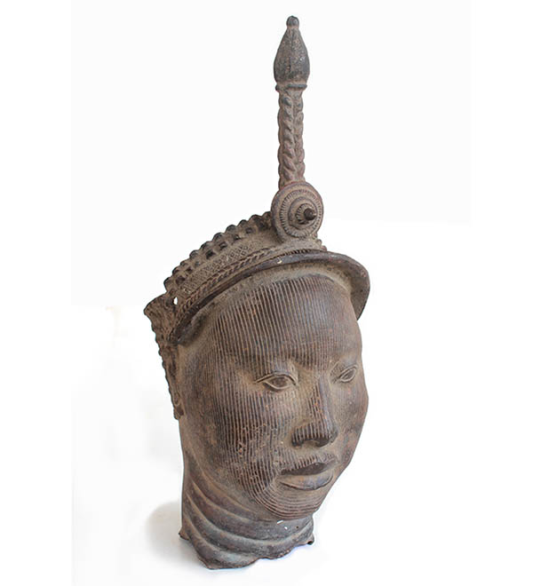 Von diesem Typ eines Gedenkkopfes wurde von Ethnologen, damals noch alles Männer, eine Legende beschrieben die etwa so geht: In den 1910 Jahren erstmals Ausgrabungen, Sensation, den die Engländer für sich historisierten, vor allen Anderen entdeckt und so weiter eben. Ähnlich wie: Columbus habe Amerika entdeckt und dabei die Wikinger und die Chinesen vergessen, die schon lange vor ihm diesen Kontinent bereisten. Die in der heutigen Antropologie dominierenden Frauen schreiben halt ab weil Wahrheit sei, was in standesdünkelnden Büchern steht. Wie viele andere Geschichten, ergänzte, korrigierte oder widerlegte die Galerie auch davon Einiges. Dieser hier abgebildete Typus ist Europäern schon länger bekannt als 1910 und dürfte wohl für die Besteller der Ife in Benin gegossen worden sein. Was als These allerdings noch im Bereich der Vermutung liegt.