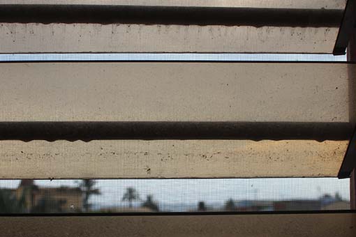 Von Harmattandreck getrübtes Fenster mit Blick auf den Atlantik |