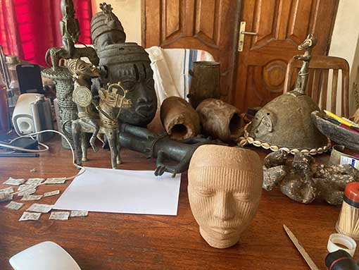Auf dem Foto links zu sehen sind ein paar der Probeentnahmen, die ins Labor gehen. Der Schwerpunkt wird wieder die Benin- und Ife-Kultur sein, aber auch aus der Elfenbeinküste, Ghana, Mali. Der Schwerpunkt der Einkäufe liegt weiterhin auf Terrakotten und auf Bronzen, damit man über Labor eine Altersbestimmung machen kann.