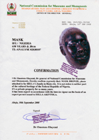 This somewhat younger, 650-year-old mask has much in common with the previous one. Some features - particularly the mouth and ears - are even more realistically rendered here than on the other mask, but this mask, like the other, is definitely an idealised head of a prominent person. Furthermore, the observation slits under the eyes clearly indicate that the mask was meant to be used. But although it is life-sized, the opening in its back is too small to fit a head, and thus it must have been intended to be held in front of the face.