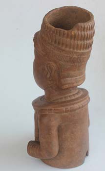 In his right hand, the figure is holding a fist with a manilla. This could be an allusion to the trading activities of a monarch. A bracelet adorns the joint. The left hand is broken off.