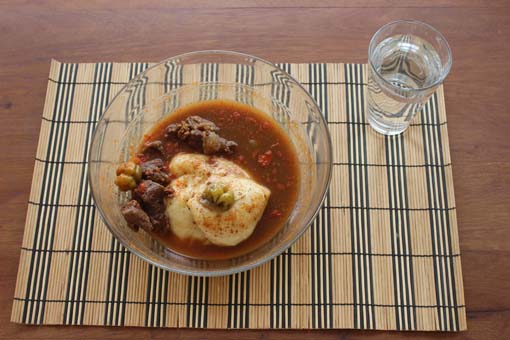 Eines der Lieblingsgerichte der Togoer. Foufou. Ein Klos aus gestampftem Ignam mit einer roten Soße und Ziegenfleisch wird mit den Fingern gegessen |