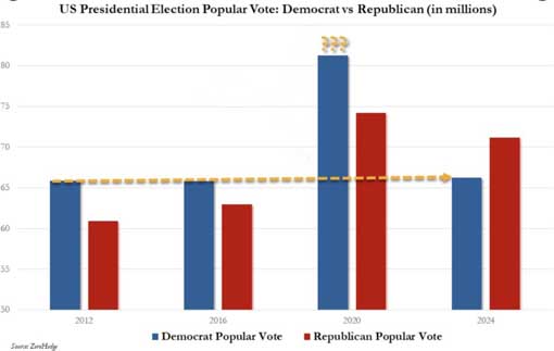 Dies ist die Statistik der US-Wahlen. Erinnern Sie sich, wie Herr Trump 2020 in den deutschen Medien durch den Dreck gezogen wurde? Wegen der Behauptung von Wahlfälschung. Etwa 15 Millionen mehr Stimmen als sonst. 2024 einfach weg. Huch !