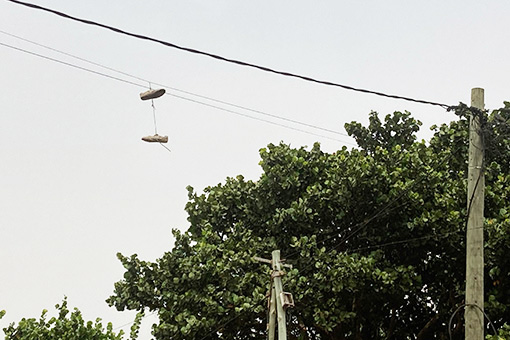 Eine Impression gönne ich Ihnen zum Schluss der kleinen Plauderei noch. Es ist ein seltsames Hobby von wem auch immer, Schuhe an Stromleitungen anzuwerfen, wo sie so lange baumeln, bis irgendwann ein Sturm die Schnürsenkel reißt. Auch das hat mit Voodoo zu tun. Es beschreibt sehr indirekt, was mich die Jahre in Togo hielt und interessierte. |