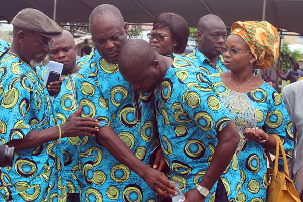 Rechts im Bild, dem Monument gegenüber, sitzen die bedeutenden Persönlichkeiten aus Baguida, Lomé und der Region. Einige der hohen Würdenträger haben ihre persönliche Kleidung. Um den Anlass auch äußerlich zu würdigen, einigt man sich im Vorfeld der Veranstaltung auf ein Stoffdesign und viele geladene Gäste lassen exklusiv für diesen Anlass ein Kostüm schneidern. Die so genannten Notablen sind Chefs, die man früher als lokale Könige bezeichnete, Sous-Chefs, Vertreter bedeutender Familien und ihre Frauen sowie Direktoren, Administration und Gendarmerie.