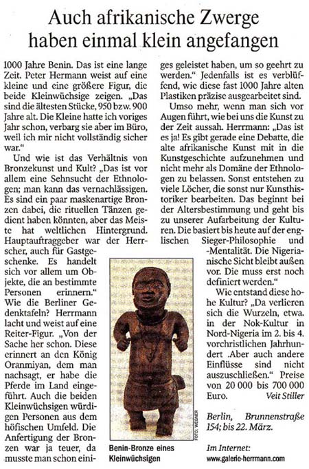 Wie entstand diese hohe Kultur? "Da verlieren sich die Wurzeln, etwa. in der Nok-Kultur in Nord-Nigeria im 2. bis 4. vorchristlichen Jahrhundert .Aber auch andere Einflüsse sind nicht auszuschließen." Preise von 20 000 bis 700 000 Euro.