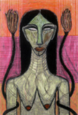 In the multipanel series 4 Women, Sambo creates iconic female half-nudes in saturated pigments and penciled embellishments, static save for mysterious differences in hand position; Ngingangi uses the same techniques to express a fearful dynamism. Sambo lives and works in Berlin. |