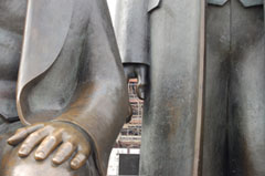 Über einen Zeitraum von zwei Jahren beobachtete die Zeugin den Rückbau und Abriss vom Palast der Republik auf dem ehemaligen Schlossplatz in Berlin und dokumentierte, für die Ausstellung komprimiert, eine kleine, aussagekräftige Serie. In unmittelbarem Zusammenhang steht das abgebaute Monument von Karl Marx und Friedrich Engels, das Marx-Engels-Forum.